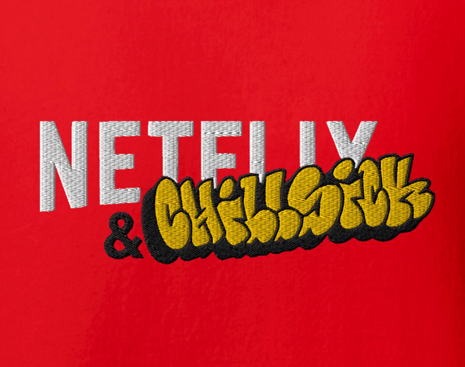 フロントにNETFLIX & CHILLSICKのグラフィックを刺繍加工でオン。