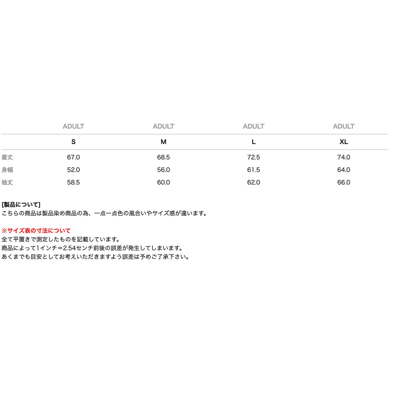 ※こちらの商品は製品染め商品の為、一点一点色の風合いやサイズ感が違います。カラー、サイズはあくまでも目安としてお考えください。 顔料染め加工の特質上、白物、淡色物と一緒に洗濯すると色移りすることがありますのでご注意ください。