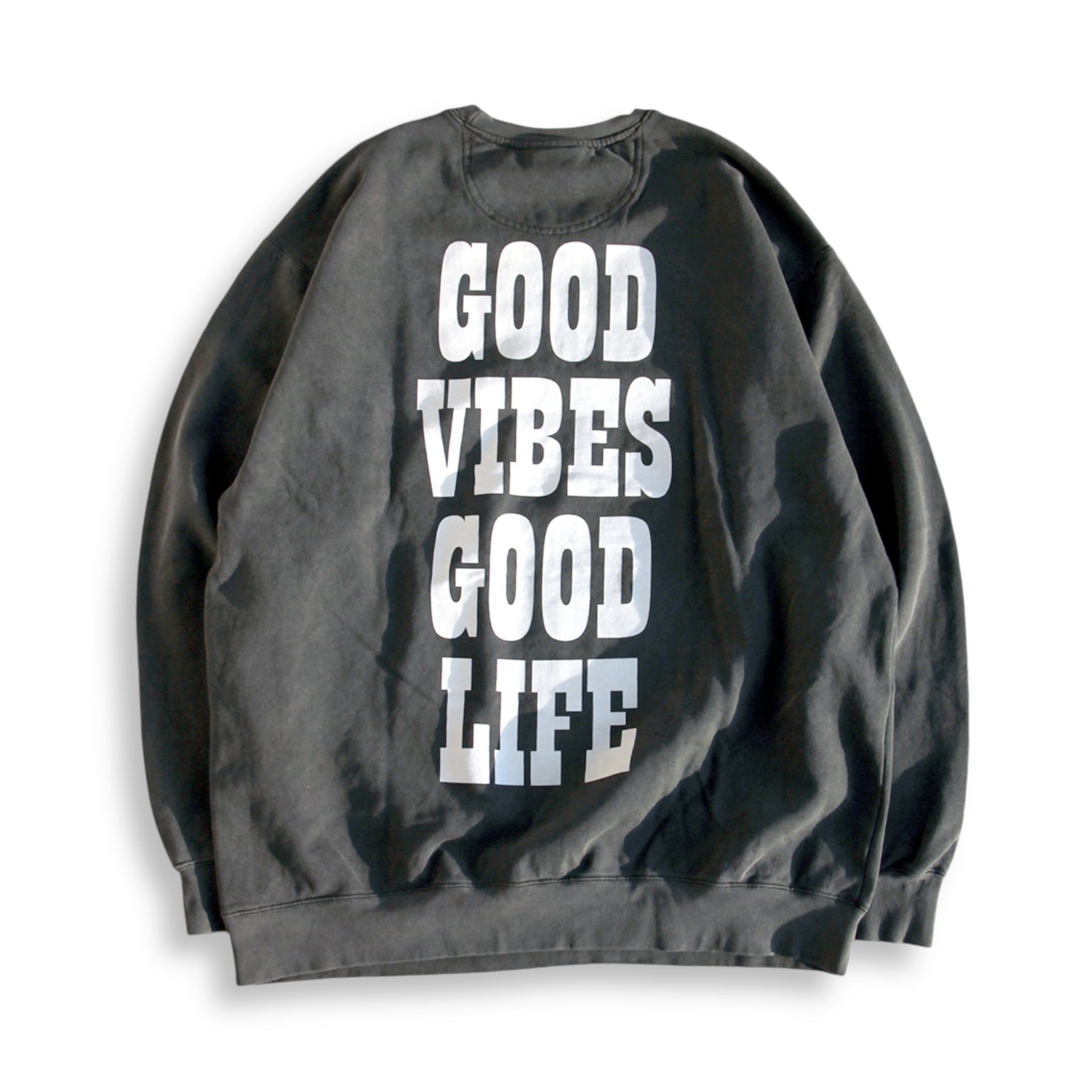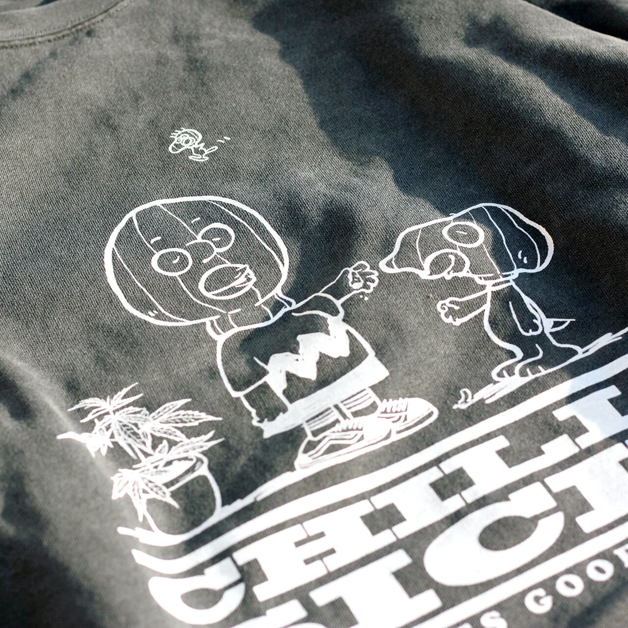 後染め加工されたボディーに染み込みプリント(※ペッパーはラバープリント)で古着のようなビンテージライクな風合いを再現しています。